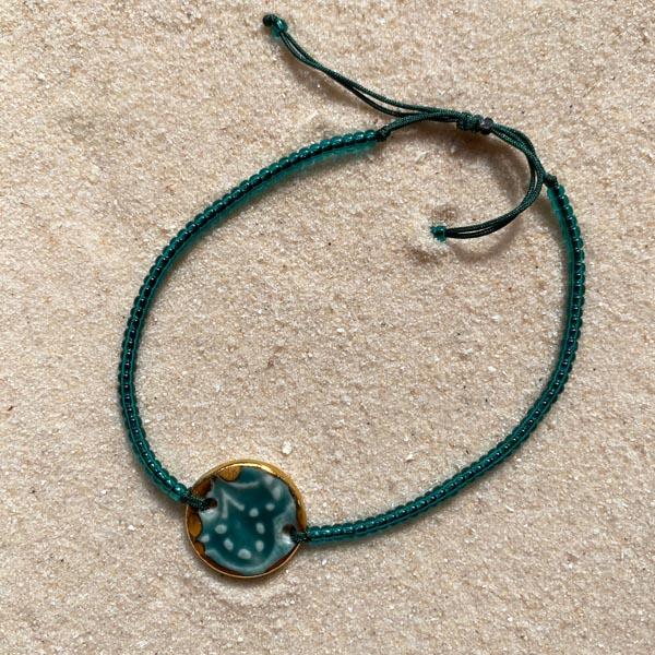 Armbandje met porseleinen rondje. De armband is gemaakt van glaskraaltjes (Miyukikraaltjes, 2mm) en sluit met een schuifknoop.