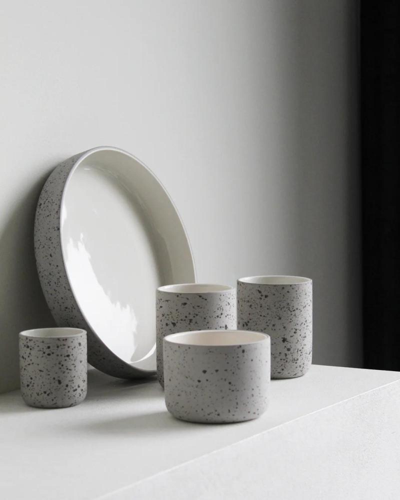 De Fundament serie bestaat uit steengoed van twee lagen. Een gladde praktische witte binnenlaag en een zacht geschuurde buitenkant. Kan in vaatwasser.