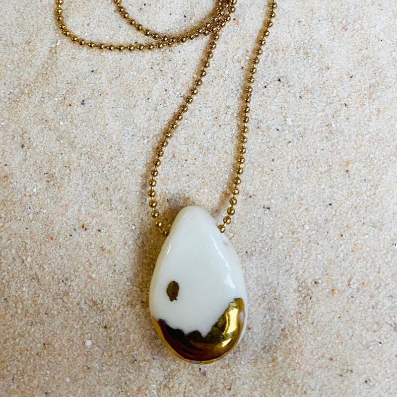 De Grieks- Nederlandse Marinella houdt van de kwetsbare uitstraling van porselein. Het eindeloos verfijnen en dunner werken is haar uitdaging. Alle kettingen zijn stainless steel, een basis metaal met een dikkere goudkleurige coating. Met ballchain ketting.