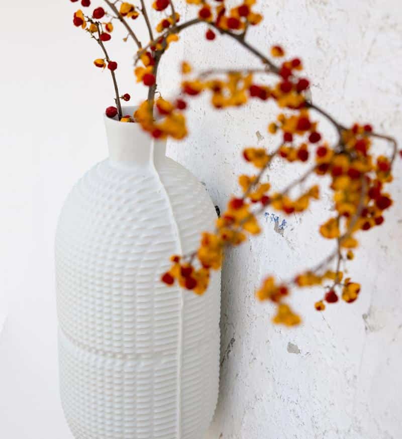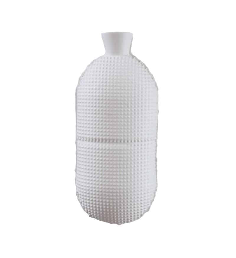 De structuur van de hangende vaas is gemaakt met een computergestuurde snijder. Door de snijder grotere stappen te laten maken dan nodig is voor een ‘soepele’ vorm, ontstaat er structuur. Zoals de kleine blokken in een afbeelding met niet genoeg pixels. De visualisatie van deze techniek wordt gecombineerd met gietproductiekenmerken van keramiek; de naden van twee matrijsdelen zijn duidelijk zichtbaar en het giethuis werd de kraag bij de opening voor de bloemen. Deze vaas toont perfectie en imperfectie van verschillende technieken. Het ontwerp van de hangende vaas is een eerbetoon aan de uitvoerende technieken, nieuw en oud, als een kunstwerk aan je muur. Porselein.