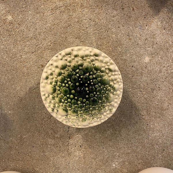 Door het handmatig bewerken van de mal ontstaat een reliëf van druppels (Drops) in verschillende patronen. In combinatie met de kleurverlopen in het glazuur ontstaan er unieke schalen met wisselende optische effecten. Deze schalen zijn dubbelwandig gegoten met een opening aan de onderzijde waardoor ze ook aan de wand kunnen hangen.