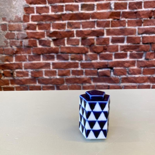 Geglazuurd porselein. De kenmerkende techniek waarmee keramiste Corien Ridderikhoff deze vazen decoreert is de batiktechniek. Hierbij worden afwisselend vlakken met bijenwas en glazuur gevuld. Zo ontstaat er een fraai contrast. Doordat het glazuur dik is aangebracht heeft de vaas een mooi reliëf-effect. De inspiratie voor veel van het werk van Ridderikhof komt van Aziatisch keramiek, architectuur en textielpatronen. EKWC alumnus, 2019.