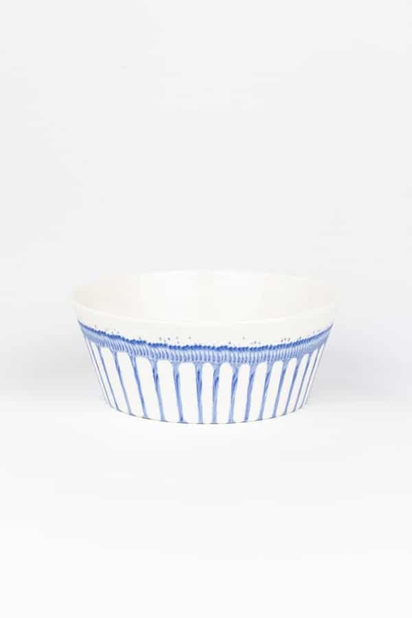 De bowls zijn gemaakt met de druppelmachine MOCA. De machine druppelt vloeibare klei (porselein met kobalt oxides) volgens een bepaald ritme in een mal. Elk patroon is uniek door de verschillende codes die gebruikt zijn. Vervolgens wordt de mal ingegoten met porselein. Het gieten, de finishing touch en het glazuren worden met de hand gedaan in de studio in Eindhoven. De bowls kunnen in de vaatwasser, maar het heeft de voorkeur ze met de hand af te wassen.