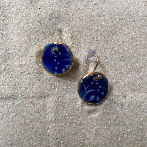 De Grieks- Nederlandse Marinella houdt van de kwetsbare uitstraling van porselein. Het eindeloos verfijnen en dunner werken is haar uitdaging. Het blauw verbindt voor haar Griekenland en Nederland. Alle oorringen en haakjes zijn goldfilled - zilver waar een laag goud is ingeperst.