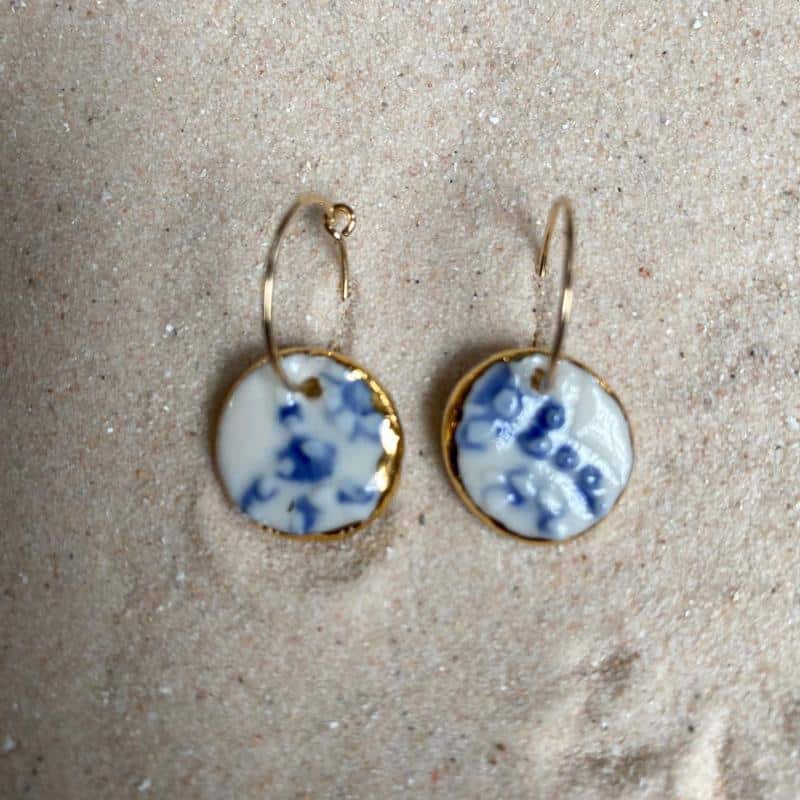 De Grieks- Nederlandse Marinella houdt van de kwetsbare uitstraling van porselein. Het eindeloos verfijnen en dunner werken is haar uitdaging. Het blauw verbindt voor haar Griekenland en Nederland. Alle oorringen en haakjes zijn goldfilled - zilver waar een laag goud is ingeperst.