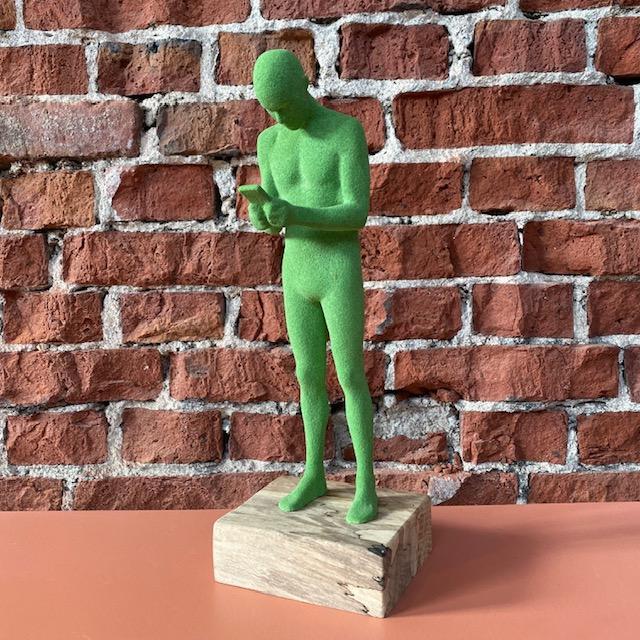 Koen observeert hedendaags menselijk gedrag rond het gebruik van mobiele telefoons, inclusief het bestuderen van lichaamshoudingen bij het gebruik van een mobiele telefoon. Tijdens zijn werkperiode bij het EKWC in 2021 scande Dudink een menselijk model in 3D en printte de scan vervolgens in twee formaten om mallen te gieten. Voor de grotere sculpturen maakte hij inpersmallen, voor de kleinere sculpturen gietmallen. Voor het glazuur koos hij sinter-engobes vanwege hun matte textuur. Op houten sokkel.