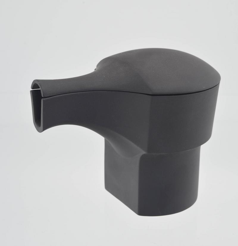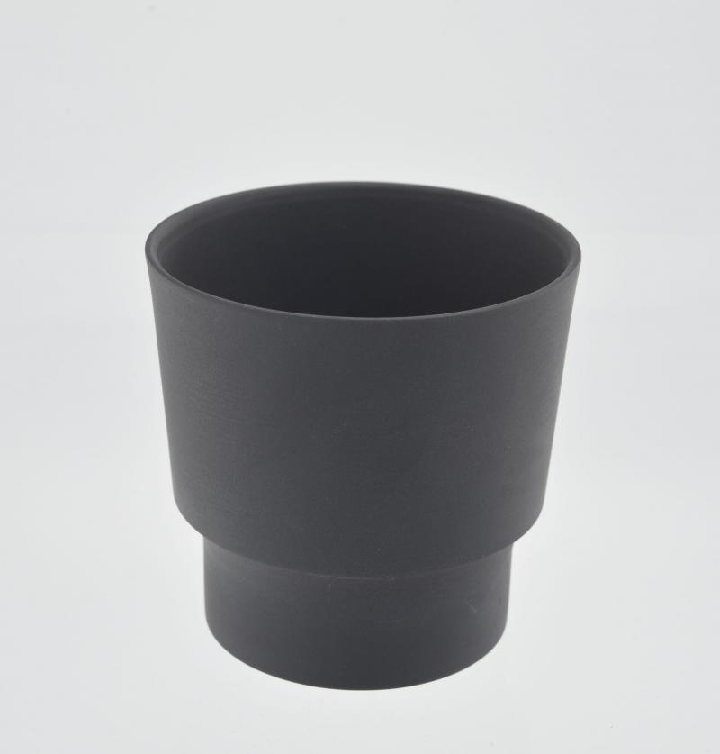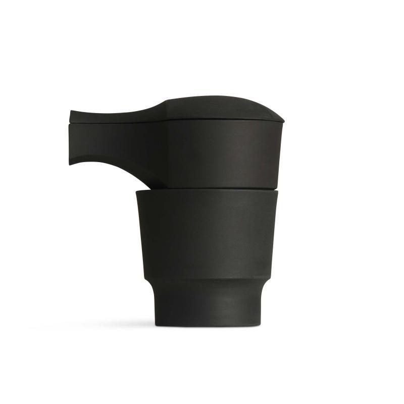 De kleine karaf vormt het begin van de serie Harvey. Vanaf de achterkant lijkt het op een kopje, maar als het een kwartslag wordt gedraaid, verandert het uiterlijk volledig. De voorkant bestaat uit een tuit, waardoor deze een tegengestelde vorm heeft aan de beker. Dit object is gemaakt van een diep warm antraciet porselein. Door de met de hand gepolijste afwerking is het oppervlak dicht en geeft het een subtiele glans.