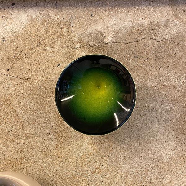 De Puntkom heeft een verfijnd optisch effect door de naar een punt toe lopende binnenzijde. Dit effect wordt verder benadrukt door het subtiele kleurverloop in het glazuur. Het glanzende oppervlak vormt een mooi contrast met de matte, naturel witte buitenkant van de kom. Door het variërende kleurverloop in de glazuurlaag krijgt iedere kom een uniek karakter. De schalen zijn dubbelwandig gegoten en hebben een opening aan de onderzijde, waardoor ze aan de wand kunnen worden opgehangen.