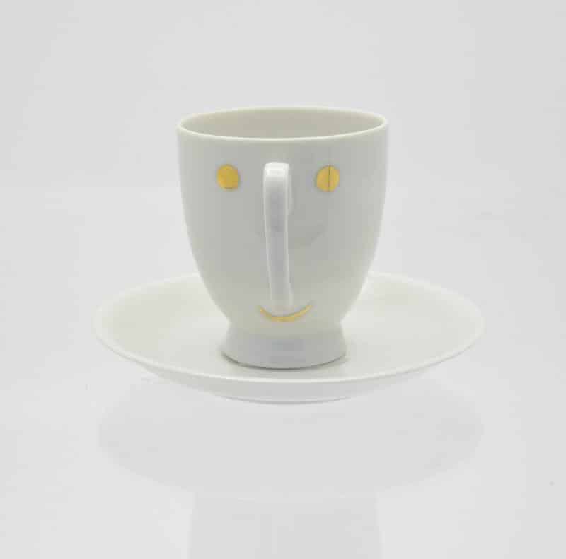 Dit kopje van het Duitse kwaliteitsporceleinmerk Thomas is door Corien Ridderikhof voorzien van een glimlach van goudluster.