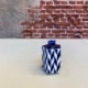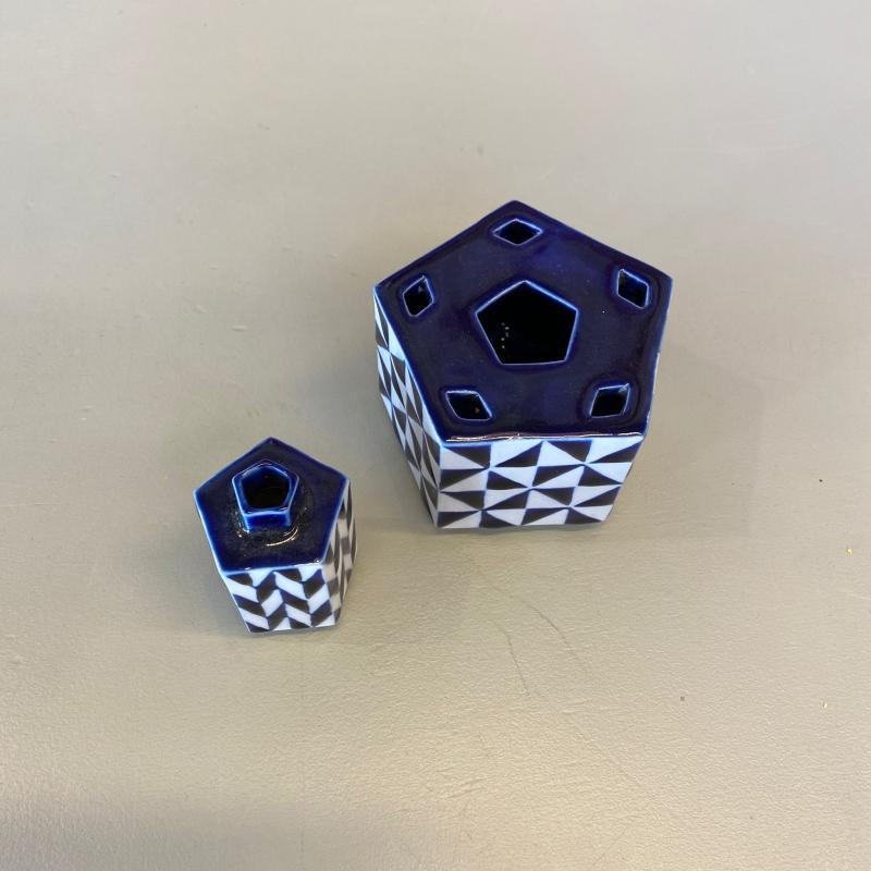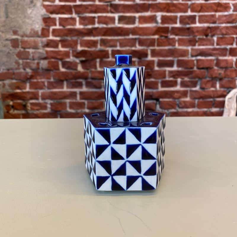 Geglazuurd porselein. Torentje met 2 verdiepingen, ook los te gebruiken. De kenmerkende techniek waarmee keramiste Corien Ridderikhoff deze vazen decoreert is de batiktechniek. Hierbij worden afwisselend vlakken met bijenwas en glazuur gevuld. Zo ontstaat er een fraai contrast. Doordat het glazuur dik is aangebracht heeft de vaas een mooi reliëf-effect. De inspiratie voor veel van het werk van Ridderikhof komt van Aziatisch keramiek, architectuur en textielpatronen. EKWC alumnus, 2019.